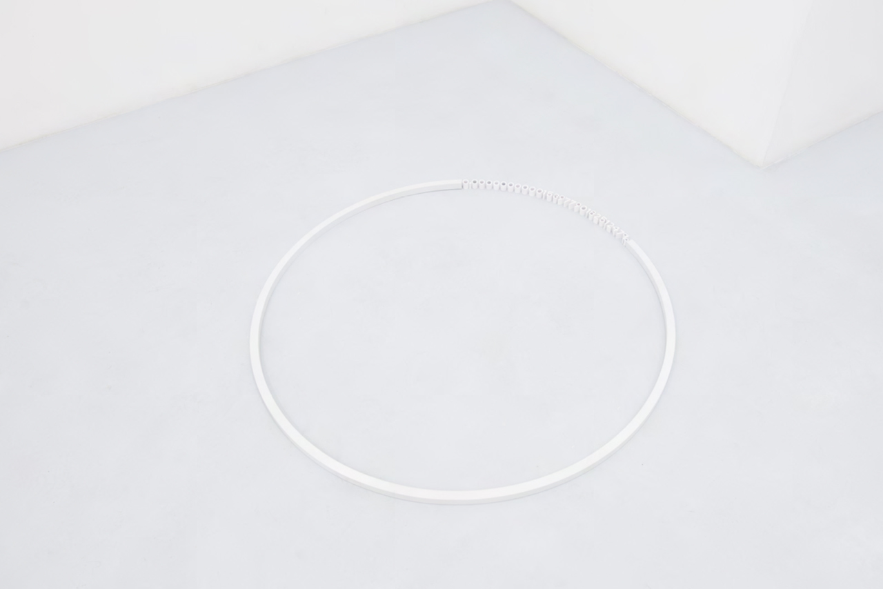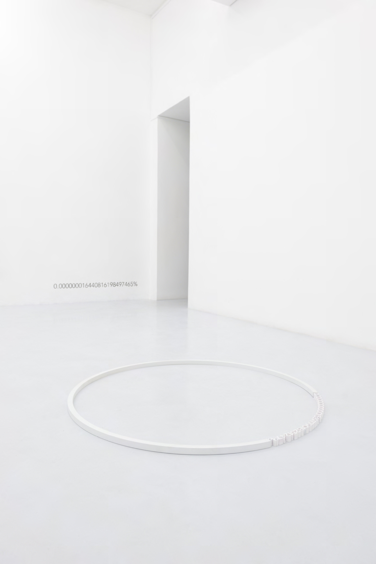 For this sculpture Dávila compares the area of a circle that measures one meter in diameter with the total surface of the Earth. The percentage that represents this comparison is a peripheral way to approach spatial dimension, the circle is perceived as an immediate form, its measurements are familiar and can be easily imagined, this does not happen with Earth. An outside reference point is always required to create a sense of space.